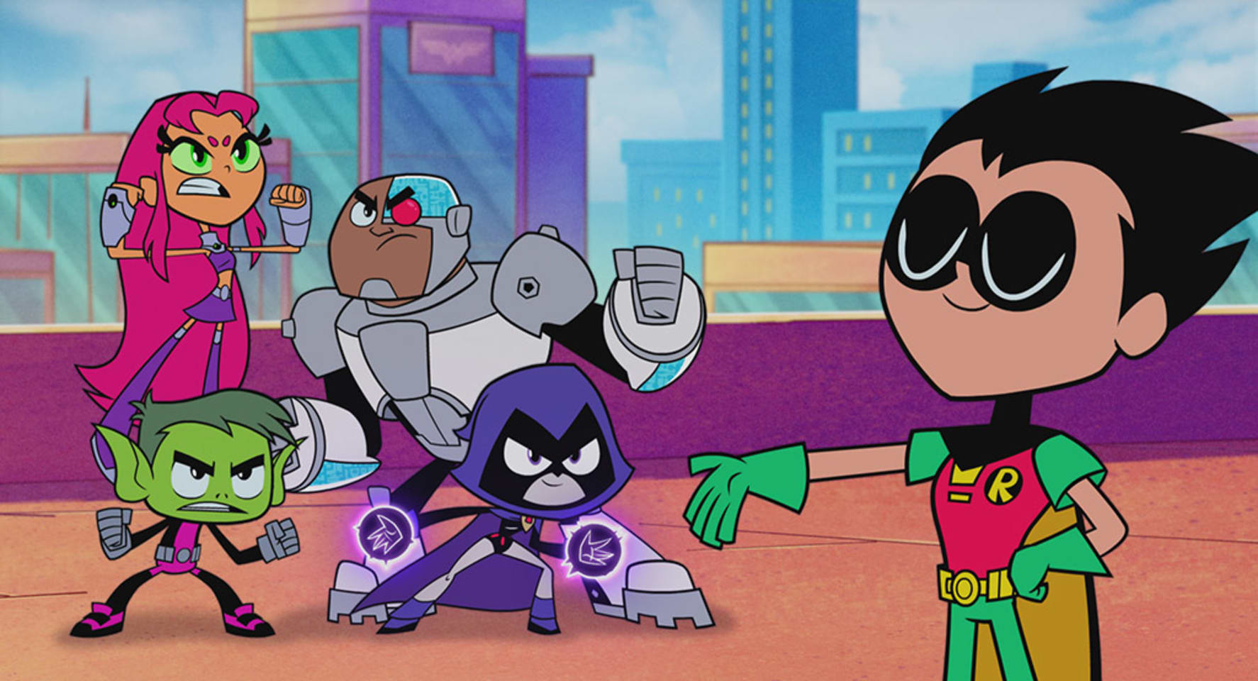 Робин, напарник Бэтмена и лидер команды Юных титанов, решает исправить вопиющую несправедливость. Если даже Аквамен получил собственный фильм, то чем они хуже?! Друзья отправляются в Голливуд, полные желания стать героями лучшей в мире супергеройской картины. Но на пути им попадается суперзлодей Слэйд, мечтающий поработить Землю, так что Робину, Киборгу и остальным придётся пересмотреть свои планы.